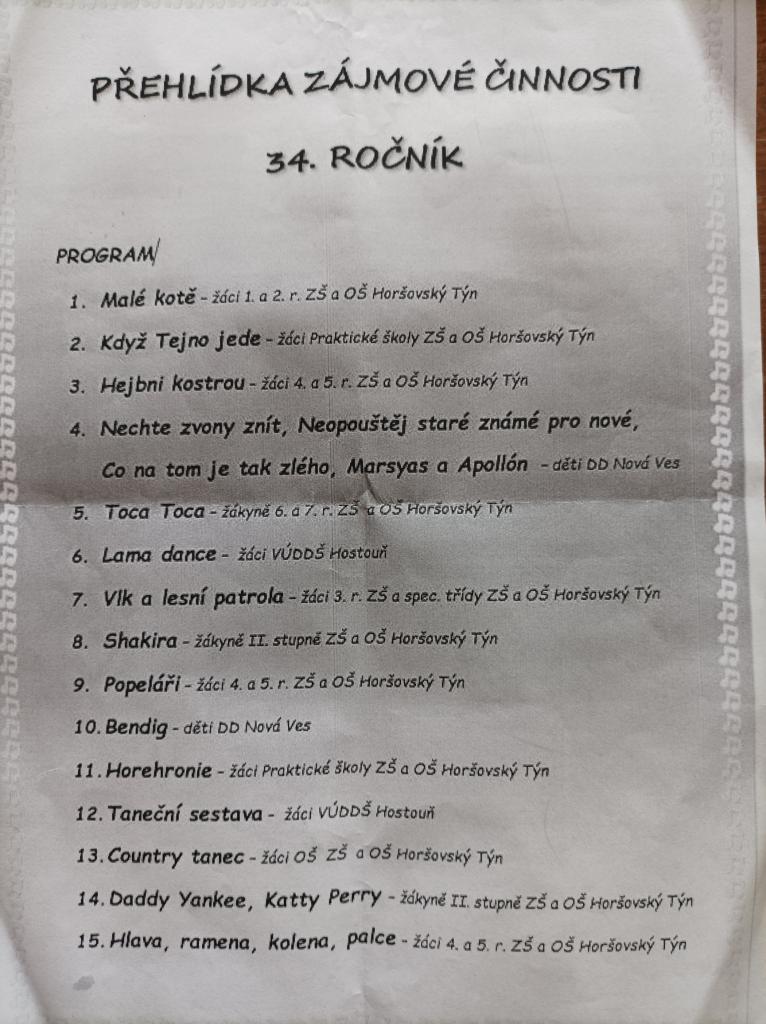 Dne 25. 4. 2024 se konal 34. ročník přehlídky zájmové činnosti. Všichni jsme si to užili a vystoupení byla skvělá!